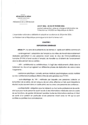 Bénin: Loi N° 2026-02 du 09 février 2026 portant prévention, prise en charge et élimination de l’infection au VIH/SIDA en République du Bénin.